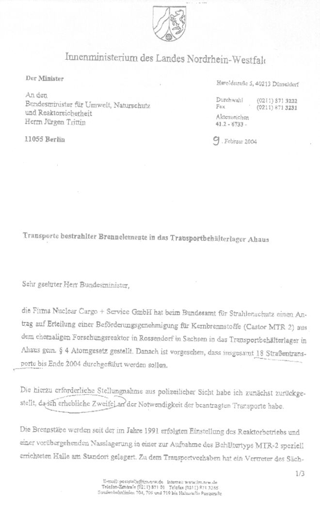 Briefwechsel NW-Innenminister Behrens - Bundesumweltminister Trittin