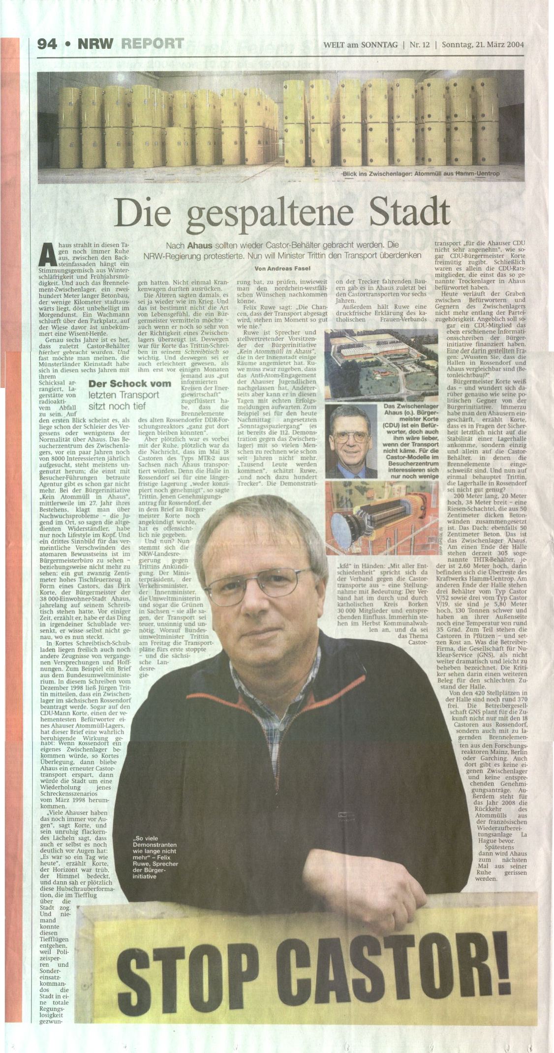 Außerdem hält Ruwe eine druckfrische Erklärung des katholischen Frauen-Verbands "kfd" in Händen: "Mit aller Entschiedenheit" spricht sich da der Verband gegen die Castortransporte aus - eine Stellungnahme mit Bedeutung: Der Verband hat im durch und durch katholischen Kreis Borken 30 000 Mitglieder und entsprechenden Einfluss. Immerhin stehen im Herbst Kommunalwahlen an, und da sei das Thema Castortransport "für die Ahauser CDU nicht sehr angenehm", wie sogar CDU-Bürgermeister Korte freimütig zugibt. Schließlich waren es allein die CDU-Ratsmitglieder, die einst das so genannte Trockenlager in Ahaus befürwortet haben.