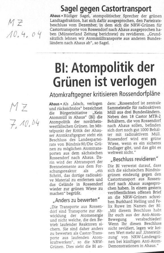 Rüdiger Sagel, atompolitischer Sprecher der NRW-Grünen, äußert sich zum Vorwurf der BI-Ahaus vom 06.01.2004 in der Münsterlandzeitung vom 10.01.2004 und spricht sich dafür aus den Parteiratsbeschluß vom 14.12.2003 zu revidieren (s. unten)