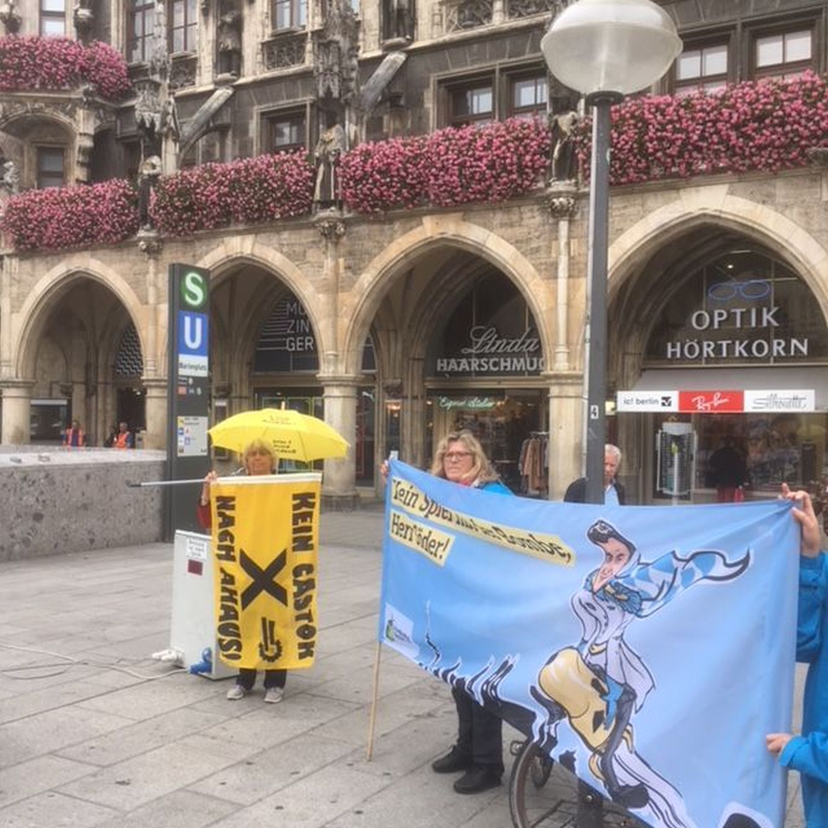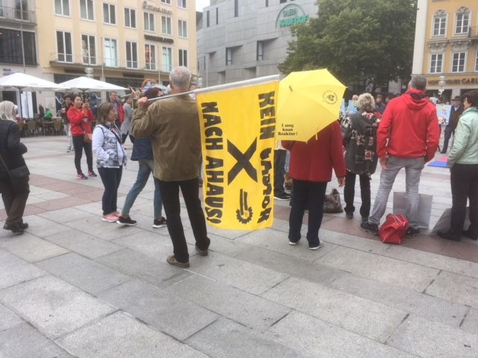 Ingrid Wundrak, Vorsitzende der Initiative "Bürger gegen Atomreaktor Garching", nutzte persönlich die Protestveranstaltung „Bombenreaktor Garching entschärfen, Herr Söder!“ vom Münchner Umweltinstitut, um mit einer Ahauser Fahne auf den Protest gegen die Transporte von Garching nach Ahaus in 2019 hinzuweisen.