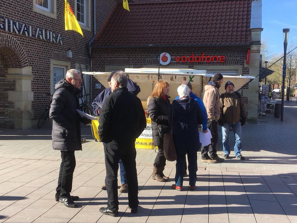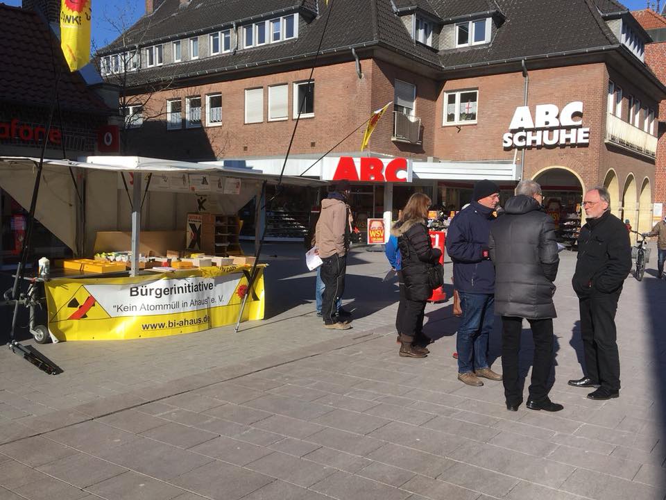 Mit einem Informationsstand präsentierte sich die Bürgerinitiative „Kein Atommüll in Ahaus“ am Samstag in der Ahauser Fußgängerzone. Bei den Informationen ging es um die Bedrohung durch neue Castor-Transporte, die auf Ahaus zukommen könnten. Im Mittelpunkt standen die beantragten Transporte von Brennelementen aus dem Forschungsreaktor FRM II aus Garching bei München. „Forschungsreaktor“ klingt zunächst einmal relativ harmlos, aber bei den Brennelementen aus Garching handelt es sich um hochangereichertes Uran mit einem Anteil von 87,5 % des spaltbaren Urans U235. Zum Vergleich: der Anteil des U235 beträgt bei den Brennelementen aus herkömmlichen Reaktoren nur 1 – 2%.