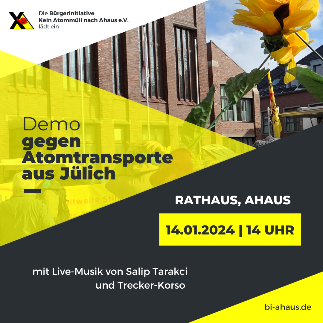 Für den jetzigen Sonntag, 14. Januar, rufen Anti-Atomkraft-Initiativen und Umweltverbände um 14 Uhr zu einer neuen Demo gegen die für dieses Jahr geplanten Castortransporte von Jülich nach Ahaus auf. Die Auftaktkundgebung beginnt um 14 Uhr am Ahauser Rathaus. Ein Trecker- Korso der Landwirte startet am TOBIT-Kreisel und führt zur Auftaktkundgebung. Vom Rathaus geht es dann gemeinsam zur Kreuzung Schumacherring/Schöppinger Straße, wo es eine Abschlusskundgebung gibt.